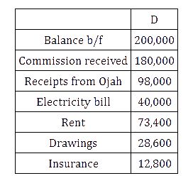 A bank statement shows an overdraft of GH¢190,000. Kofi, a debtor, paid GH¢400,000 into the account. The new bank balance is