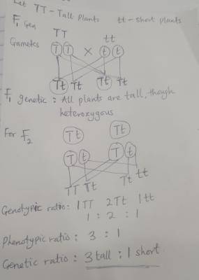 The genetic ratio of the F2 shows that there will be 3 tall and 1 short offspring plants.(See diagram above)