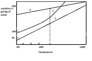 Consider the solubility curves of three salts X, Y and Z given in the diagram. If each solution of the salt contains 200 g, and is heated to 100\(^o\)C, which solution or solutions will deposit 100 g of the solute when suddenly cooled to 0\(^o\)C?