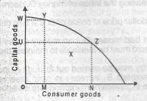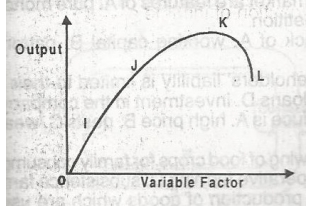 The diagram represents a production function. At which of the points does diminishing returns set in