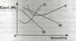 The diagram above shows a firm operating under conditions of monopolistic competition. The curve W represents its