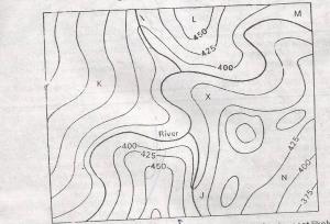 In the area covered by the contour map above, six men standing various places. Which of the men at J, K, L, M and N will NOT be able to see the man at X? (Assume that there is no vegetable cover; contours are in metres). The man is at