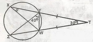 In the figure, the chords XY and ZW are produced to meet at T such that YT = WT, ZYW = 40o and YTW = 30o. What is YXW?