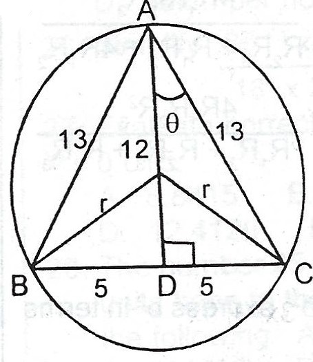 An isosceles triangle of sides 13cm, 13cm, 10cm is inscribed in a circle. What is the radius of the circle?