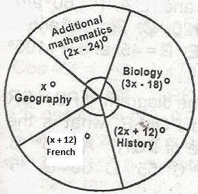 In a class of 60 pupils, the statistical distribution of the numbers of pupils offering Biology, History, French, Geography and Additional mathematics is as shown in the pie chart. How many pupils offer Additional Mathematics?