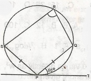 PQRS isa cyclic quadrilateral which PQ = PS. PT is a tangent to the circle and PQ makes an angle of 50o with the tangent as shown in the figure. What is the size of QRS?