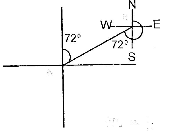 The bearing of a bird on a tree from a hunter on the ground is N72oE. What is the bearing of the hunter from the birds?