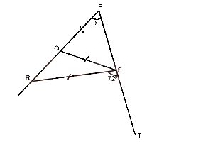 In the diagram above, PST is a straight line, PQ = QS = RS. If ∠RST = 72o, find x