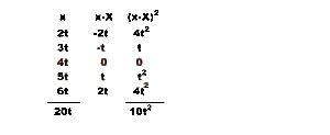 \(mean(x) = \frac{20t}{5} = 4t\\standard\hspace{1mm}deviation=\sqrt{\frac{10t^2}{5}}\\\sqrt{2}=\sqrt{\frac{10t^2}{5}}\\\sqrt{2}=\sqrt{2t^2}\\2 = 2t^2\\t^2=1\\t=1\)