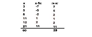 mean deviation \(= \frac{\sum|x-\bar{x}|}{n} = \frac{28}{6}\)