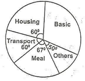 The pie chart shows the income of a civil servant in month. If his monthly income is N6,000. Find his monthly basic salary.