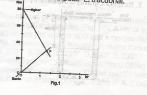 Two taxis leave benin and agbor some 80km apart at 1200hr as shown above. from the distance time graph shown the distance of their meeting point P, from Benin and the time of their meeting are