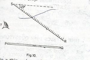 PQ is a thin rod on a horizontal table, RS is a plane mirror inclined at \( 45^{\circ}C\) to the horizontal as shown above. The image of PQ as seen in the mirror by the eye T is