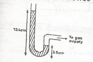 When one arm of a U-tube manometer is connected to a gas supply, the levels of mercury in the two arms of the U-tube is shown in the figure above, if the atmospheric pressure is 76.0cm hg, the gas pressure is