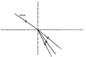 In the diagram above a beam of white light travels from a rare to a dense medium. What colours of light do the rays a, b and c respectively represents?