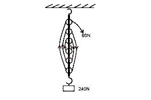 The diagram above is a block and tackle pulley system in which an effort of 80N is use to lift a load of 240N. The efficiency of the machine is