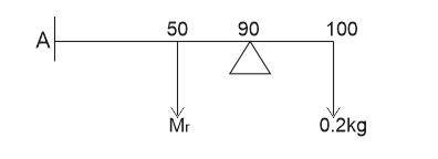 The diagram shows a uniform meter rule AB which balances horizontally at the 90cm mark when a mass of 0.2kg is suspended from B. Calculate the mass of the meter rule.