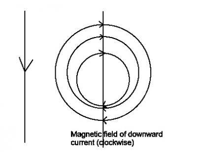 At a point due N of the wire, the field is due west, at a point due S of the wire, the field is due eest.