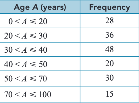 According to the table below, what is the frequency for the 50 ≤ A < 70 age range?