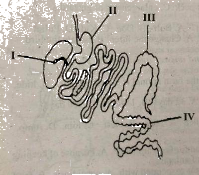 Cellulose digestion by micro-organisms takes place in the part labelled _______