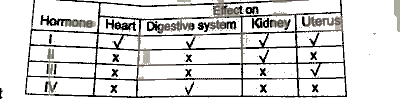 The table above shows the effect of hormones I,II,III and IV on some parts of the human body. Where (✓) represents effects and (X) represents no effect of hormone on the corresponding part of the body. study it and answer this question.