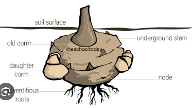 A corm is a short, vertical, swollen underground stem of a plant that acts as a storage organ for food, typically starches, allowing the plant to survive through unfavorable conditions like winter or drought; essentially, it's a solid, fleshy bulb-like structure that differs from a true bulb by lacking layered scales and being entirely solid tissue inside; common examples of plants that grow from corms include crocus, gladiolus, and freesia.