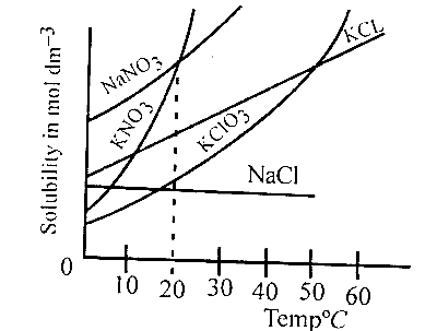 At what temperature does the solubility of \(KNO_{3}\) equal that of \(NaNO_{3}\)?