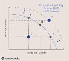 Point X in the production possibility curve represents an inefficient use of resources, while points A, B, and C on the PPF curve represent the most efficient use of resources by the economy.