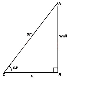 A ladder 9m long leans against a vertical wall, making an angle of 64° with the horizontal ground. calculate correct to one decimal place, how far the foot of the ladder is from the wall.
