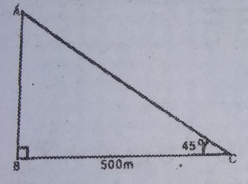 At a point 500m from the base of a water tank the angle of elevation of the top of the tank is 45o. Find the height of the tank,