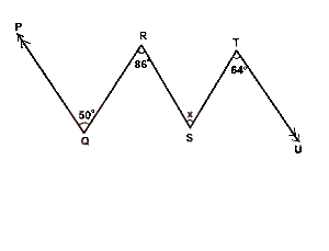 In the diagram above, PQ is parallel to TU, ∠PQR = 50°, ∠QRS = 86° and ∠STU = 64°. Calculate the value of x.