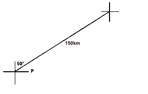 A town P is 150km from a town Q in the direction 050