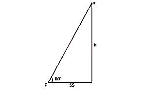 The angle of elevation of the top X of a vertical pole from a point P on a level ground is 60o. The distance from P to the foot of the pole is 55m. Without using tables, find the height of the pole.