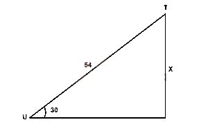 The angle of elevation of a point T on a tower from a point U on the horizontal ground is 30o. If TU = 54m, how high is T above the horizontal ground?