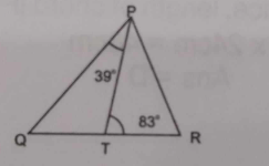 In \(\triangle PQR\). T is a point on QR such that \(\angle QPT = 39^o and \angle PTR = 83^o. Calculate \angle PQT\)