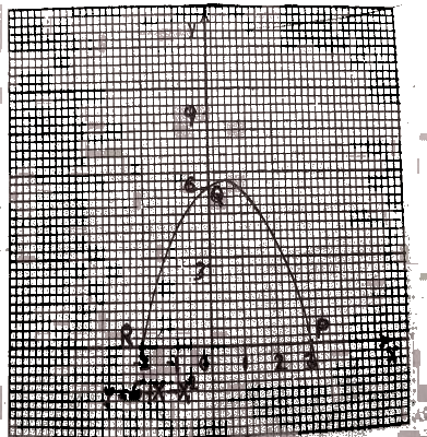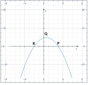 The diagram is the graph of \(y = 6 + x - x^2\). The graph intercepts the x- axis at P and R and the y- axis at Q.