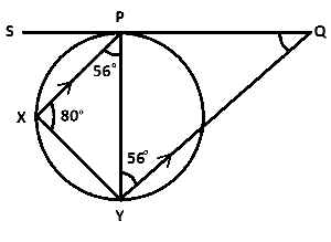 In the diagram, SQ is a tangent to the circle at P, XP||YQ, ∠XPY = 56 o and ∠PXY = 80 o.Find angle PQY