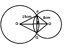 In the diagram O and O' are the centres of the circles radii 15cm and 8cm respectively. If PQ = 12cm, find |OO'|.
