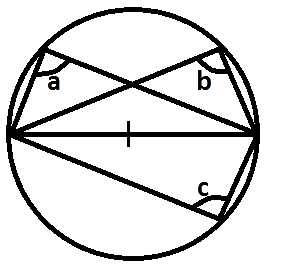 In the diagram O is the centre of the circle. Which of the following is/are not true? I. a = b II. b + c = 180o III. a + b = c