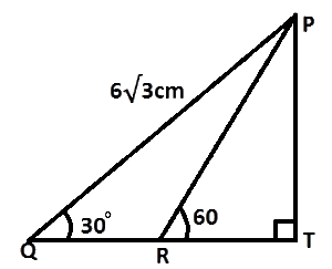 In the diagram, QRT is a straight line. If angle PTR = 90°, angle PRT = 60°, angle PQR = 30° and |PQ| = \(6\sqrt{3}cm\), calculate |RT|