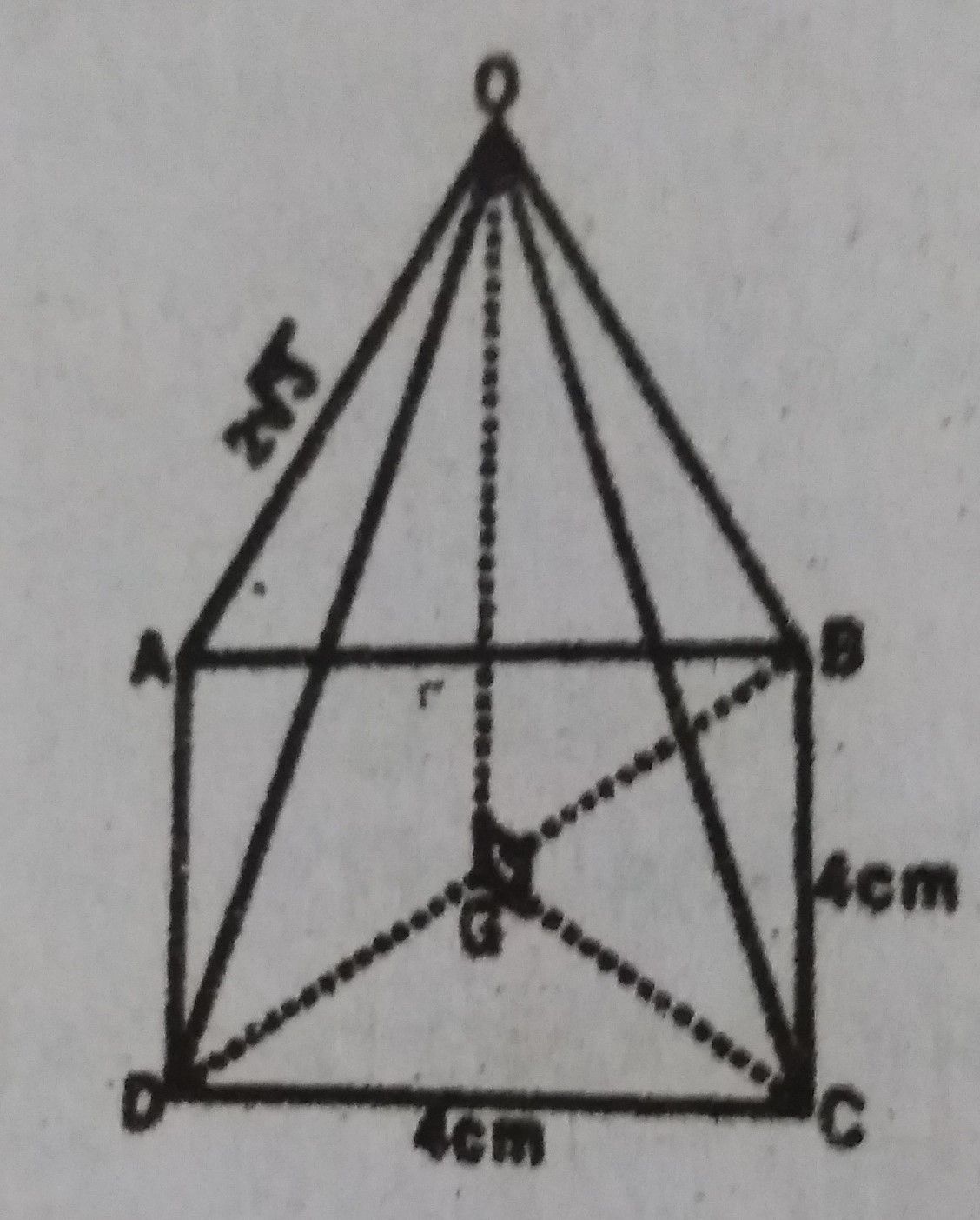 A right pyramid is on a square base of side 4cm. The slanting side of the pyramid is \(2\sqrt{3}\) cm. Calculate the volume of the pyramid
