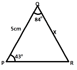 In\( ∆ PQR, P\hat{Q}P = 84^°, |Q\hat{P}R |= 43^°\) and |PQ| = 5cm. Find /QR/ in cm, correct to 1 decimal place.