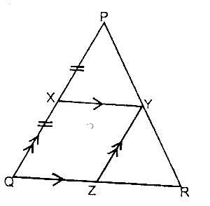 In the figure /PX/ = /XQ/, PQ//YZ and XV//QR. What is the ratio of the area of XYZQ to the area of \(\bigtriangleup\)YZR?
