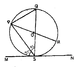 In the diagram, the tangent MN makes an angle of 55o with the chord PS. IF O is the centre of the circle, find < RPS