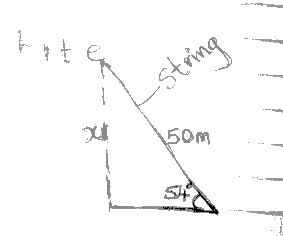 A kite flies on a taut string of length 50m inclined at tan angle 54o to the horizontal ground. The height of the kite above the ground is