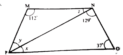 In the diagram, MN//PO, < PMN = 112º, < PNO = 129º, < NOP = 37º and < MPN = yo. Find the value of y