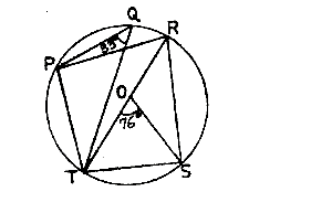 In the diagram, O is the centre, \(\bar{RT}\) is a diameter, < PQT = 33\(^o\) and <TOS = 76\(^o\). Using the diagram, calculate the value of angle PTR.
