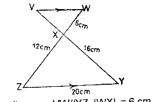 In the diagram, VW//YZ, |WX| = 6cm, |XY| = 16cm, |YZ| = 20cm and |ZX| = 12cm. Calculate |VX|