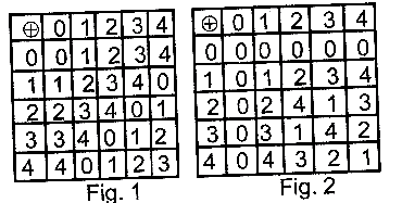 Fig. 1 and Fig. 2 are the addition and multiplication tables respectively in modulo 5. Use these tables to solve the equation (n \(\oplus 4\))