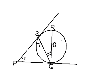 In the diagram, PQ and PS are tangents to the circle O. If PSQ = m, <SPQ = n and <SQR = 33\(^o\), find the value of (m + n)